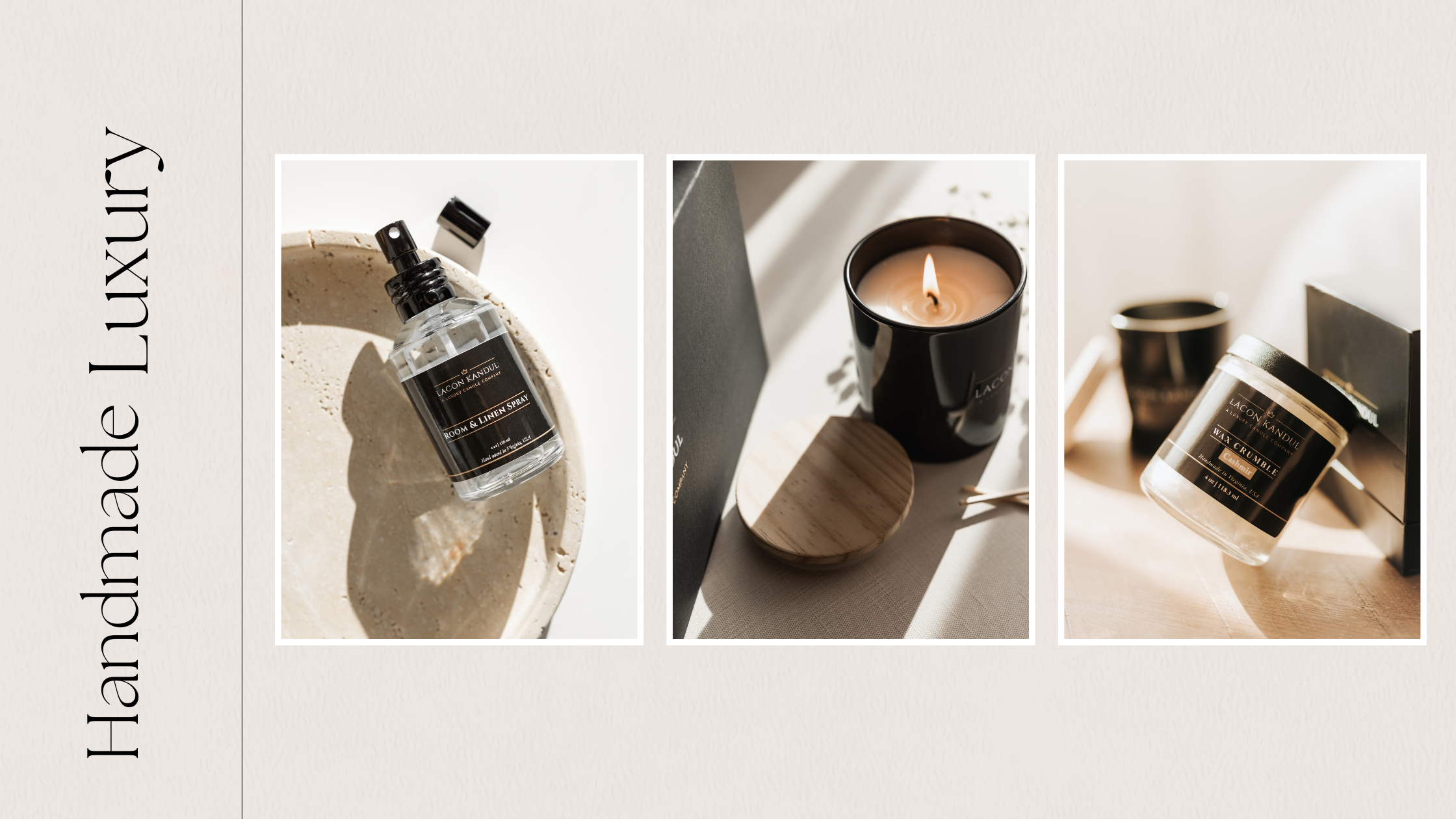 Discover the exquisite world of Lacon Kandul, your premier destination for premium home fragrances. We specialize in eco-friendly coconut soy candles, wax melts, wax crumbles, and room and linen sprays, all handcrafted in Virginia, USA. Immerse yourself in our unique fragrance portfolio, featuring subtle, evocative, and eclectic scents designed to elevate your living space.